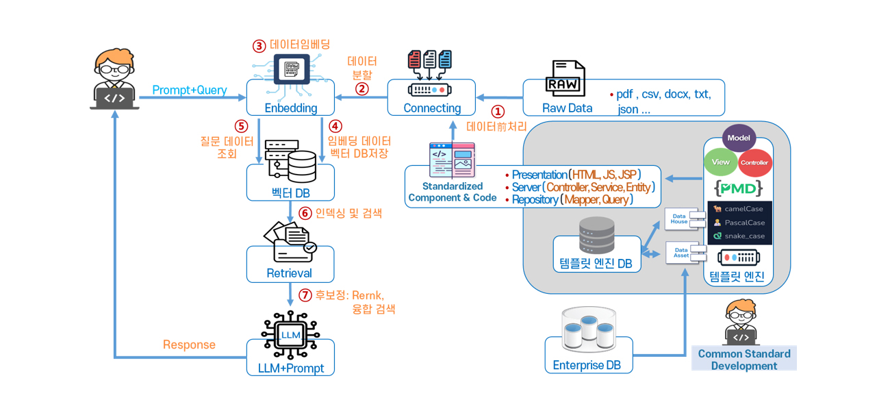 기업의 핵심 자산을 통해 '표준설계도(Template)'을 생성하고, 생성형 AI의 유연성을 결합하여 비즈니스에 적합한 Full-Stack 코드를 생성하는 혁신적인 플랫폼입니다.